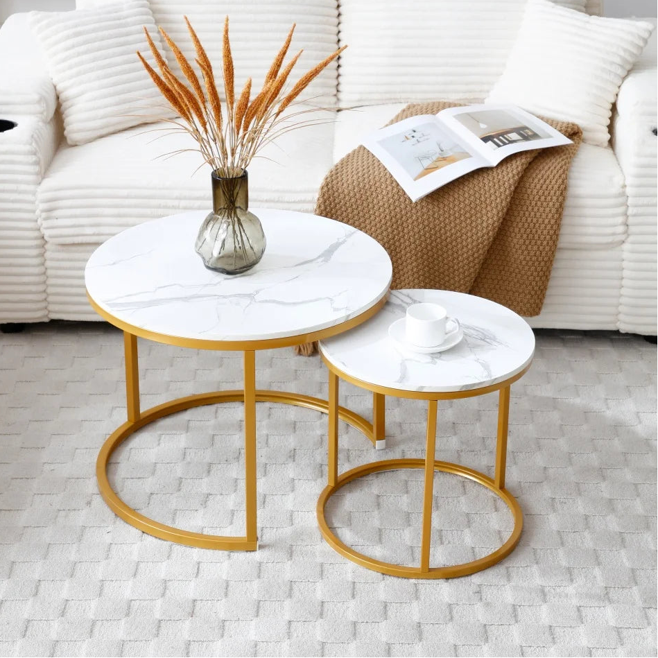 Nesting white round coffee table include a large table and a small table. A small table can be placed under the bigger one to save spaces . You can combine them as you like.